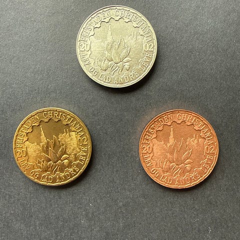 Christiania mønter sæt af 1 løn 2022, sølv, kobber og messing