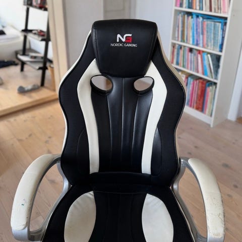 Stol med lys i. Lidt slitage på sædet men det er kun syninger, der er ikke gået hul. Kan køre op og ned. Sælges fordi den er blevet for lille, er ellers fejlfri