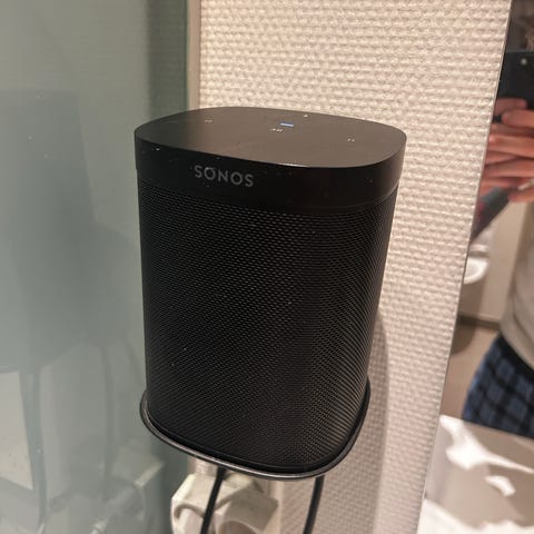Sonos One Gen 2 højttaler i hvid farve med kompakt design. Højttaleren er beregnet til indendørs brug og har en ledning til strømforsyning. Den har en minimalistisk og moderne udformning med kontrolknapper på toppen.