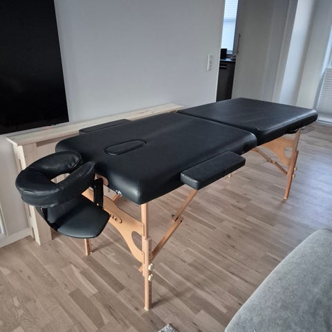 Transportabel massagebriks fra Earthlite i rigtig god stand. Aftagelig hovedstøtte samt uldtæppe og transportpose medfølger. Kan justeres i højde.