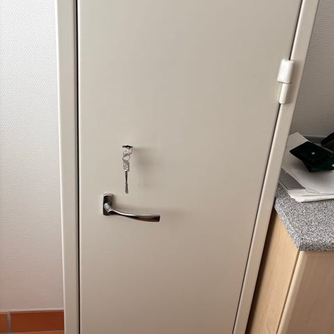 Skabet er hvidt og har låsemekanisme med nøgle.