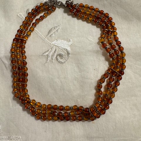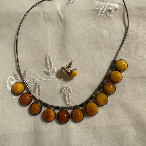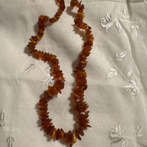 Halskæde i sølv med stort naturligt rav. Vedhænget har et organisk, blad- og grenformet design inspireret af art nouveau, med ravet indfattet i et håndarbejdet sølvstel. Ravet har en varm gylden tone med synlige naturlige indeslutninger. Smykket fremstår som et ældre kunsthåndværkssmykke med tydeligt fokus på form og materialer. Fra 1950’erne-60’erne, oprindeligt fra Klarlund.