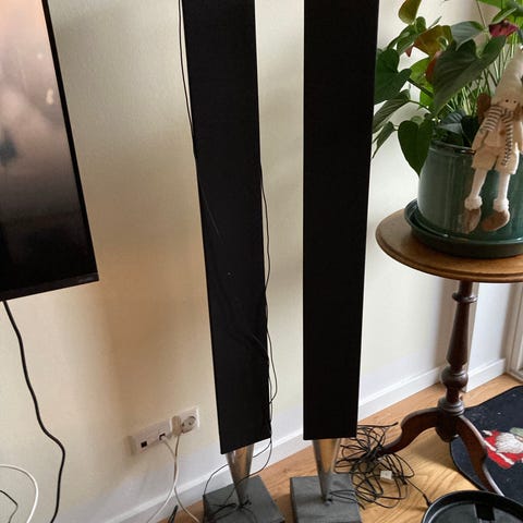 Bang & Olufsen højttalere i sort metal med slankt og højt design. Velegnet til brug i hjemmet for lydafspilning. Har et minimalistisk udseende med stålfod og stofbeklædning foran.