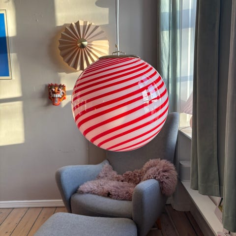 Der er ikke noget at sige til, hvis du bliver lidt lækkersulten, når du ser det her bolche. Denne fine Murano loftslampe har den flotteste karamelnuance og kommer med et flot ophæng i patineret messing.