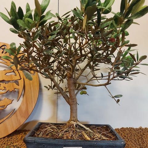 Oliven Bonsai (Olea europaea) fra Portugal i Bezem/Hokidachi-stilen, med en grå stamme og sølvgrønne blade, cirka 39 cm høj og 34 cm bred, i en potte med diameter 25 cm. Klik på den blå "gå til varen" knap, for at købe eller byde på denne vare. Den samlede pris vil blive vist inden du afgiver dit bud.