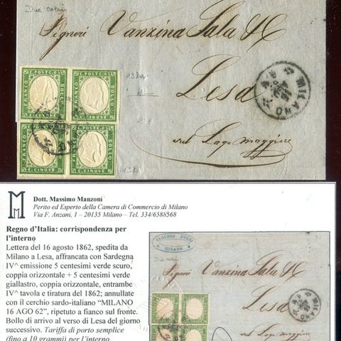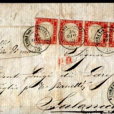 Brev i porto tildelt af Circondario for Roma affrancata parret 2 baj verde. Frimærkerne ankom og blev annulleret med penstrøg og dobbelt rød cirkel fra Roma, vurderet til 8 point. Brevet stammer sandsynligvis fra Fiumicino, som det er angivet i certifikatet G. Chiavarello. Perfekt match, sjældent og af stor interesse for specialisten. Katalogpris € 2200,00+++ (kun for de ankomne annulleringer).