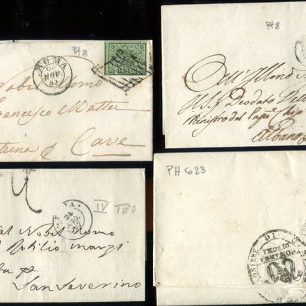 Interessant posthistorisk samling fra de Pontifiske Stater, med titel Interessante insieme di Storia Postale di Pontificio, tilstand Annullato, 1852–1868, Sassone 2, 2 preannullato, 2A, 2+4Aca. 3 frazionato, 27. Klik på den blå "gå til varen" knap, for at købe eller byde på denne vare. Den samlede pris vil blive vist inden du afgiver dit bud.