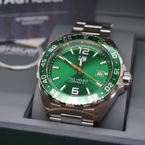 Dette er et TAG Heuer Formula 1 Professional 200 Meters quartz-ur med grøn og rød krans.