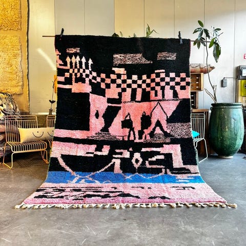 Sjældent vintage marokkansk Boujad tæppe – samlerstykke – håndvævet af naturlig uld, 200 × 350 cm, fremstillet i Marokko, i meget god stand. Klik på den blå "gå til varen" knap, for at købe eller byde på denne vare. Den samlede pris vil blive vist inden du afgiver dit bud.