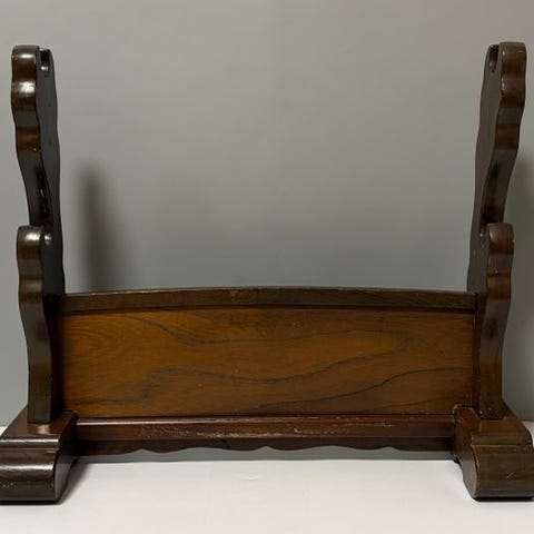 Højkvalitets træsværdestativ med tre kreative Tsuba-formede hullete design, der kan rumme fire klinger, dimensioner 60 × 20 × 42 cm, vægt 2,61 kg, fremstillet i Japan, i god stand med slid og mærker. Klik på den blå "gå til varen" knap, for at købe eller byde på denne vare. Den samlede pris vil blive vist inden du afgiver dit bud.