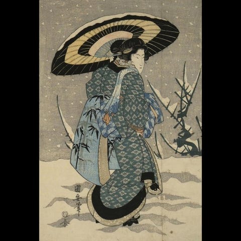 Otte japanske papirsblade fra Edo-perioden af Utagawa Kunisada, med titlen Collection of Japanese beauty Satirical Kyōka on Women’s Education, hver blad måler 360 × 246 mm, med synlige misfarvninger og aldersrelateret toning, oprindelse privat samling. Klik på den blå "gå til varen" knap, for at købe eller byde på denne vare. Den samlede pris vil blive vist inden du afgiver dit bud.