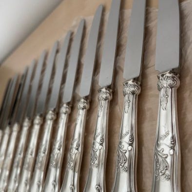 Superb kvalitet sølvpletteret fiskegafler sæt (16) af Roberts & Belk, sølvsmede. Stilfuldt designet kniv og trefork, lavet i art deco-perioden, originalt bestikæske med fløjl indvendigt og juvelermærke Southgate, Halifax i London. Næsten ubrugt sæt i fremragende stand.