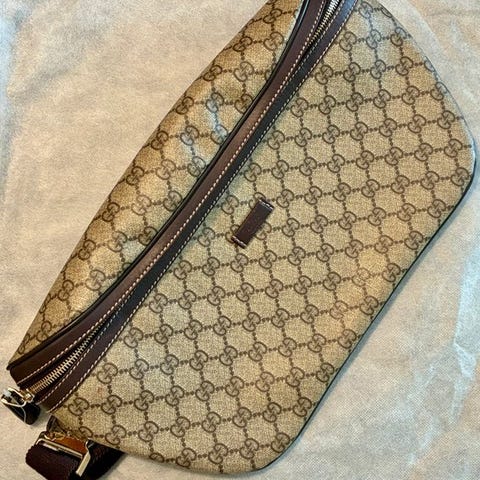 Gucci crossbody pung med GG-mønster i beige canvas med sorte læderdetaljer, monogrammønster, størrelse lille, 13 cm højt, 24 cm bredt, 5 cm dybt, ægthedskode 682933-527066, med støvpose. Klik på den blå "gå til varen" knap, for at købe eller byde på denne vare. Den samlede pris vil blive vist inden du afgiver dit bud.