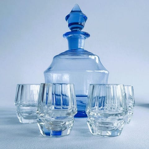 Sæt med 6 likørglas i krystalklar, blyfri, smaragdgrøn krystal skabt af verdensberømte glasblæsere og skærere fra Moser med det ikoniske mønster 'Lady Hamilton', lavet i 1934, en af virksomhedens største designklassikere (ikke signeret). Gennemsigtige paneler, skåret, flade kanter uden finish, sekskantet stang og rund fod. Lady Hamilton-kollektionen fra Moser er en verdensberømt serie: elegant og afbalanceret. Opstået i 1934, inspireret af Emma Hamilton, hustru til den britiske diplomat William Hamilton og formodet elskerinde af admiralen Horatio Nelson. Dette vintage sæt blev produceret i Tjekkiet i 1950'erne. Mål: højde 9 x diameter 5,1 cm.