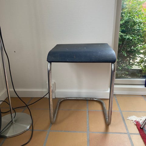 Ældre taburet/værkstedstaburet/industrimøbel fra M.H Stålmøbler i brunlakeret stål,polstret med cognacfarvet læder.
