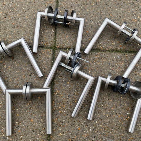 Komplette dørgreb til indendørs brug i krom/sort - sælges efter renovering. Alle er i fin stand. Pris pr sæt og der er 12 sæt i alt.