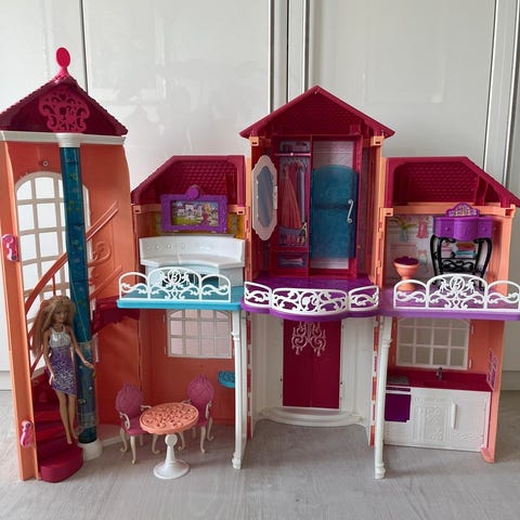 Barbie dukkehus med tilhørende møbler, tøj og tilbehør. Dukkehuset er i pink og lilla farver og kan åbnes for leg. Sættet indeholder forskellige møbler som seng, sofa og stole samt en række tøjstykker og små genstande til dukker.