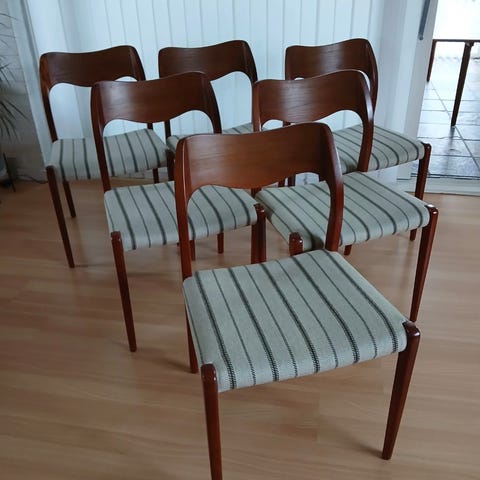 Sælger 4 stk. N O møller model 71 stole. Stolene er renoveret for nogle år siden hvor de blev slebet og lakeret samt fik nyt betræk (papirgarn). De har fungeret som ekstra stole, så er ikke blevet brugt meget. Stolene er fra min Mormor som købte dem nye i 50erne. Jeg mener de er i palisander. Sælges kun samlet.