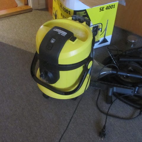 Kärcher SE 4001 gulv- og tæpperenser i gul og sort farve. Maskinen er designet til rengøring af gulve og tæpper og leveres med flere tilbehørsdele til forskellige rengøringsopgaver.