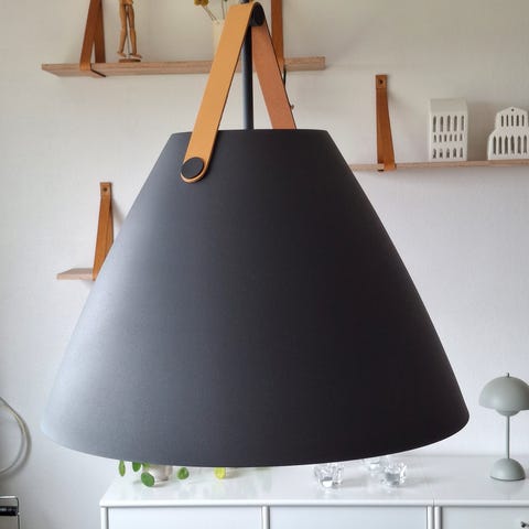 Der medfølger både brun og sort strop, samt det der skal bruges til at hænge den op (en ledning på ca. 100 cm og en ledning på ca. 60 cm).
