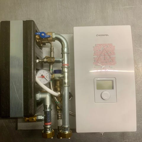 Kospel Unit består bl.a. af en pladeveksler (med særligt lavt modtryk) og en el-gennemstrømsvandvarmer, der opvarmer dit brugsvand, med supplement fra en varmepumpe. Løsningen fylder “intet” og løber aldrig tør for varmt vand.