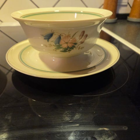 Royal worcesterskål med hank i porcelæn. Skålen har en rund form med to håndtag, der er dekoreret med en sølv kant. Velegnet til servering eller opbevaring af mad.ildfast