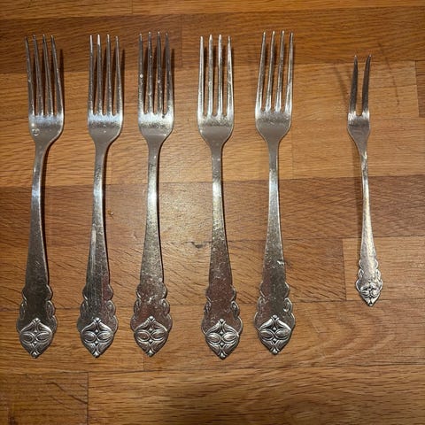 Gafler i sølv med to tænder. Gaflen har et klassisk design og er velegnet til servering af små retter eller som en del af et bestiksæt. Materialet er 2 tårnet sølv.