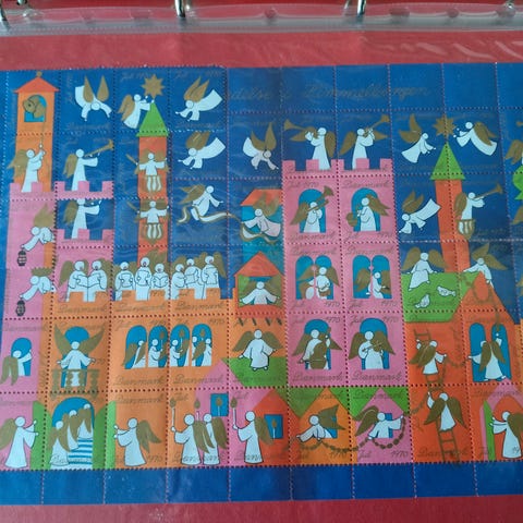 Julemærker i rammer ( glasset er revnet i flere af rammerne);