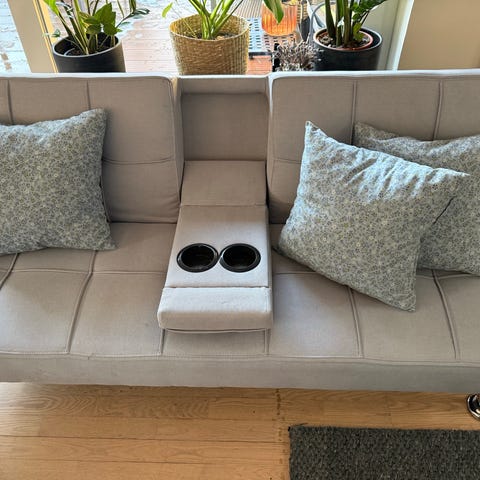 Sofa med faste hynder, der nemt slås ud til gæsteseng via klik-system. Sofaen fungerer upåklageligt.