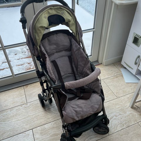 super fin rejseklapvogn som kan gå i kabinen. inkl taske hvis du ønsker en nemmere måde at håndterer på. kan ligges ned og med trepunktsele, gode solide drejehjul og bremse. alt virker