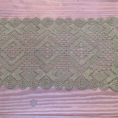 Bordløber/Festremse kniplet i olivengrøn farve. Den måler 15x103 cm, håndlavet og UBRUGT, har bare ligget i en skuffe.