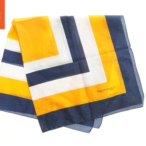 Dette tørklæde fra Saint Michele er lavet af silke og har en størrelse på 66x70 cm. Designet har en gul farve med et let skakternsmønster, og mærket Saint Michele Paris er trykt på tørklædet. Der er en etiket med plejeinstruktioner fastgjort til tørklædet.