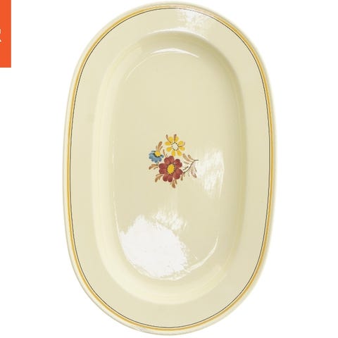 Porcelænsfad med en blå kant langs randen. Fadet er ovalformet og har en glat overflade med nogle brugsspor. Bagsiden viser et logo, som kan være relateret til producenten. Fadet kan bruges til servering eller dekoration.