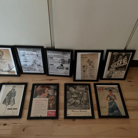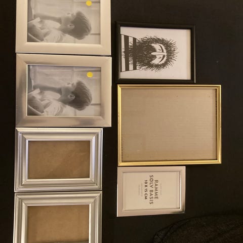 Dette er en samling af billedrammer fra IKEA, pakket i plastik. Samlingen indeholder fem rammer i forskellige størrelser og er ideelle til at præsentere billeder. De er lavet af lyst træ og leveres med ophængningskroge som en del af pakken.