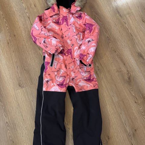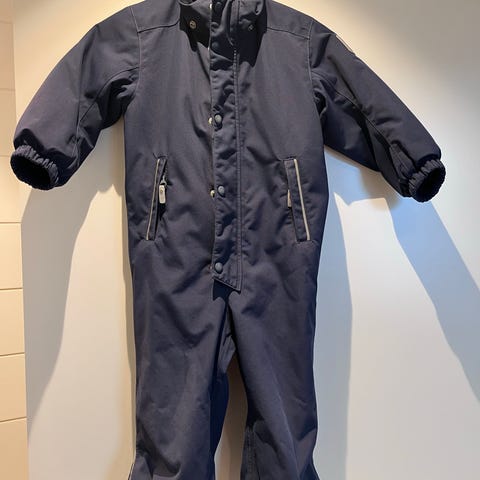 Denne flyverdragt er fra Reimatec og er primært blå. Den har en pelskrave på hætten og elastik ved ærmer og bukseben for at holde kulden ude. Dragten har lynlåse på forsiden samt refleksdetaljer for øget synlighed. Der er dobbelt lynlås-lukning og trykknapper fortil, og to lynlåslommer i fronten til opbevaring. Foran er en mærket label med størrelsen 122