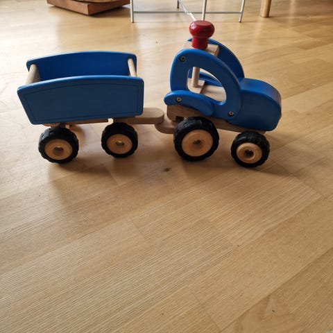 Plastiklegetøjstraktor med tilhørende anhænger, der måler 40 cm i længden. Traktoren har store gule hjul og er rød med detaljer i gul og blå. Anhængeren er grøn og gul og inkluderer en lille grå får. Legetøjet er farverigt og egner sig til børns leg og fantasi.