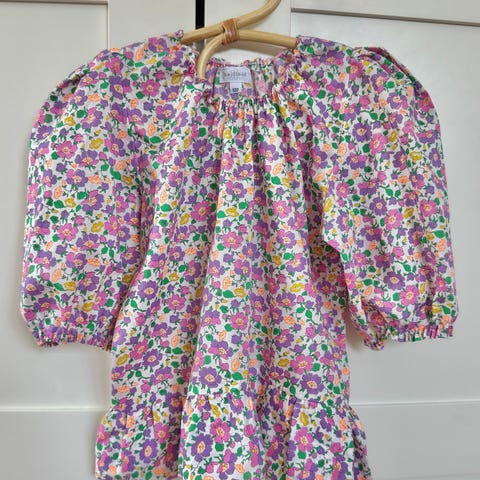 Håndsyede bukser med lyseblå og hvide tern i fastvævet økologisk bomuld. Flæser på lommer og bukseben af stof fra Liberty of London🌸
