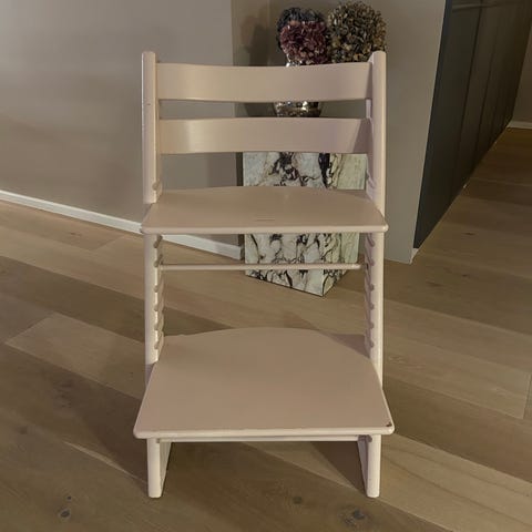 Stokke højstol i træ. Justerbar sæde- og fodplade. Designet til børn og kan tilpasses i højden efter behov.