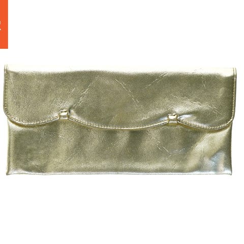 Elegant beige clutch with a textured crocodile pattern and gold-tone corner accents. The clutch is designed to hold essentials such as a wallet, phone, and keys, perfect for formal occasions or an evening out. It features a flap opening for secure storage and a streamlined look. The dimensions of this clutch are 28x14 cm.