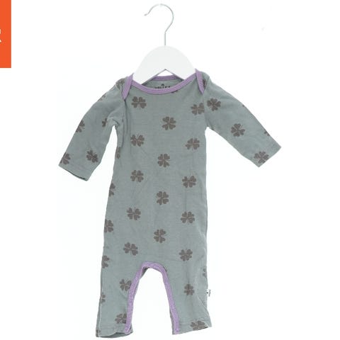 Dette er en lyserød heldragt med kort ærme og små blomsterlignende mønstre i mørkere nuancer. Dragten har flæser ved skuldrene og elastik i bunden af benene. Den lukkes med en knap bag på ved nakken.
