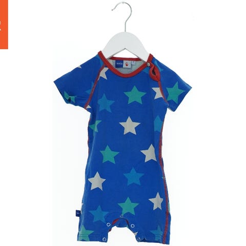 Heldragt med korte ærmer og ben, med et undervandsprint af hajer og fisk i lyse blå og grønne nuancer. Dragten har trykknapper på benene og en knap ved halsen. Den er lavet af uv-beskyttende stof og har kontrastsyninger.