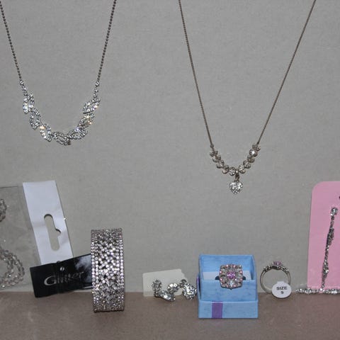 Halskæde 44 cm, armbånd 20 cm, 2 stk. ørenringehængere og 2 stk. øreklips 2,5 x 1,8 cm.