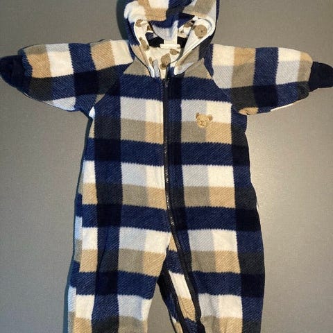 Denne heldragt til små børn er lyseblå og har et sjovt print med forskellige flyvemaskiner og helikoptere i røde, blå og grå nuancer, samt skyer over hele dragten. Den knappes foran og har lange ærmer og ben, hvilket gør den velegnet til køligere vejr.