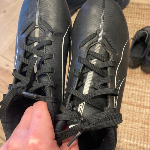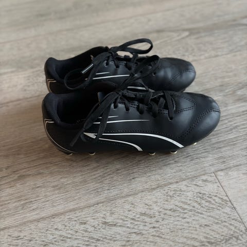 Et par sorte fodboldstøvler med knopper, ideelle til spil på græs eller kunstgræs. Støvlerne har hvide detaljer og snørebånd for bedre pasform. Logoet på støvlerne indikerer mærket som Puma. Disse er størrelse 31, passende til børn eller yngre spillere.