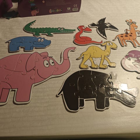 Dette puslespil har 24 brikker og leveres i en bjørneformet æske, der måler 42 x 30 cm. Designet er farverigt og venligt, ideelt for børn over 3 år. Motivet viser bjørne, der danser på en bal. Æsken er brun og bærer mærker fra Djeco, designet af Nadine Rouviere.