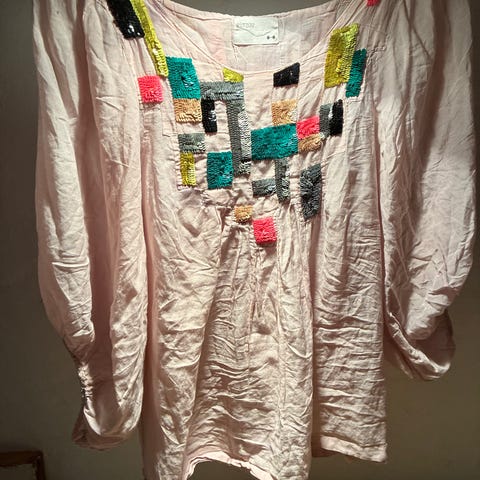 Skjorten er perfekt til festlige lejligheder - se f.eks. billede eksemplet hvor den bruges til en smuk guld paillet kjole fra Malene Birger. Hvis der er interesse, kan den smukke kjole også tilkøbes på en mine andre annoncer.