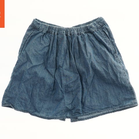 Jeans nederdel med to forlommer og to baglommer. Nederdelen har et flettet bælte i orange farve med en lille spænde. Materialet ser ud til at være denim.