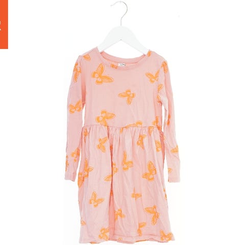 En lyserød pigekjole med stropper der har to knapper foran. Kjolen har to lommer foran og en enkel ryg uden lommer.