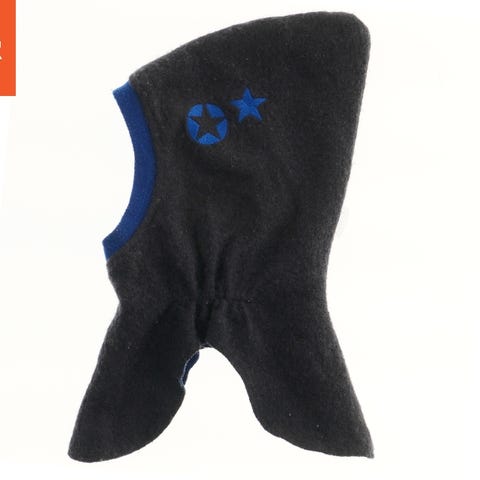 Dette er en strikket børnehue i størrelse 86. Huen har striber i blå, grøn og sort, og er lavet af blødt materiale for komfort. Designet er praktisk til kolde dage og dækker både hoved og hals. Der er et mærke med 'name it' på siden af huen.