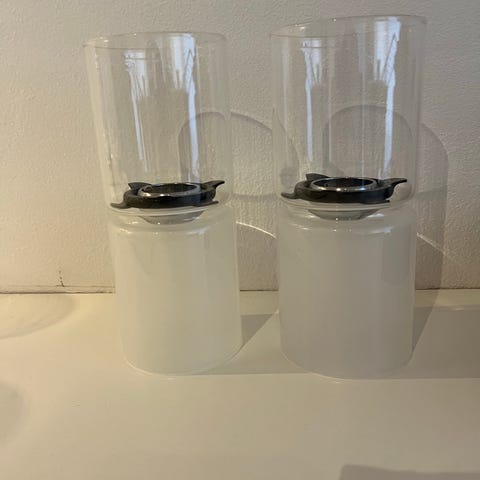 Objektet består af to Stelton fyrfads stager lavet af metal og glas. Glasdelen er cylindrisk og hviler på en bred metalbase. Størrelsen er 10,5 cm i højden, hvilket gør dem velegnede til borddekoration.